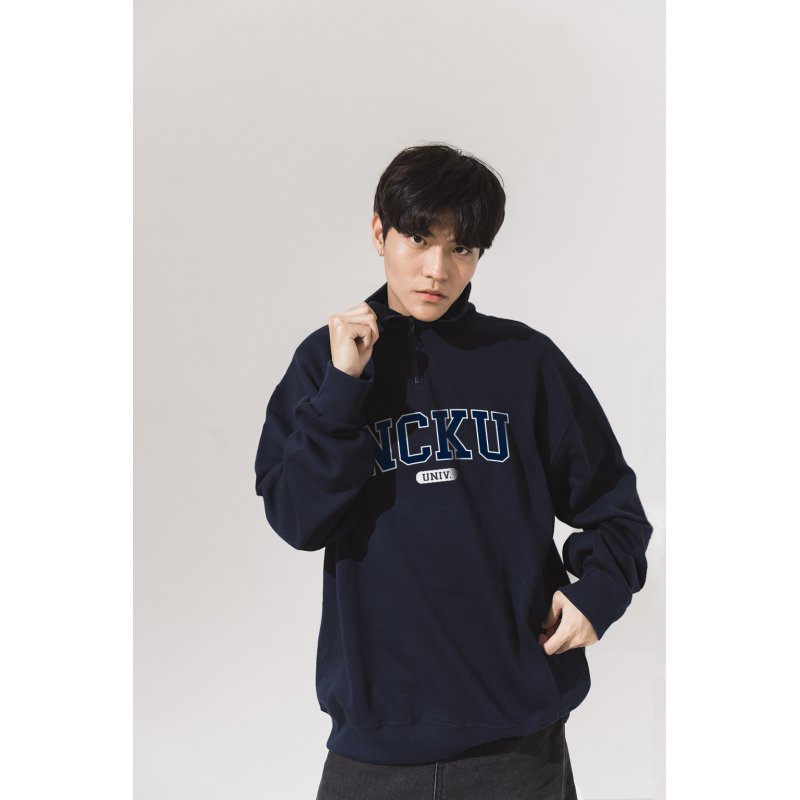 比起一般大學T,更具設計感的半開拉鍊搭配立領剪裁,保暖同時也能自由調整穿搭氛圍。